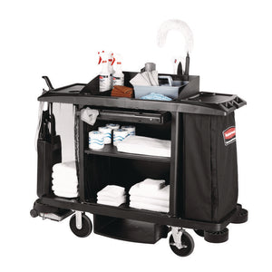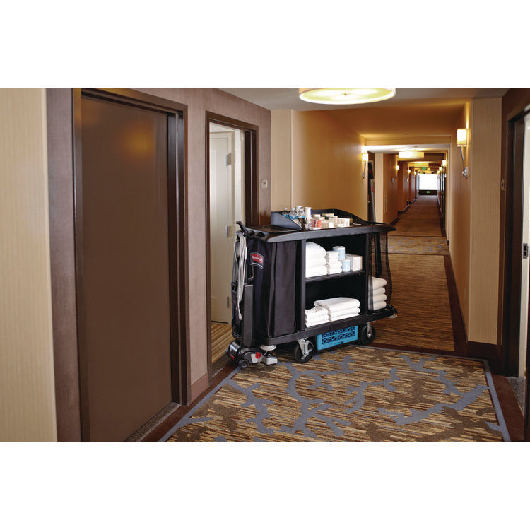 A complete system solution for housekeeping in the hospitality field. Commercial-grade molded construction with 8" non-marking wheels and locking brakes. Full-size storage cabinet plus vinyl bag, bumpers, vacuum holder and under-deck shelf.