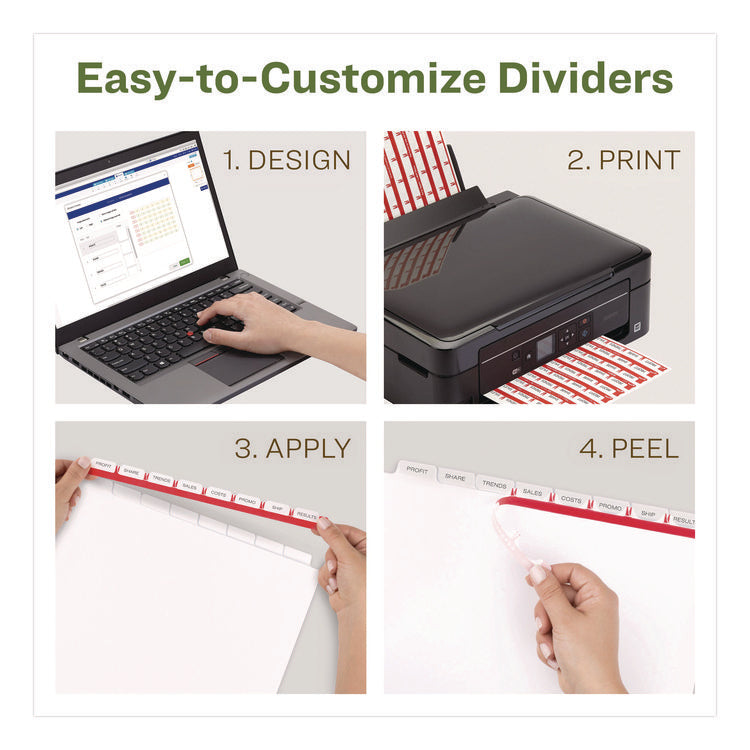 Whether you're coordinating a single project or multiple binder sets, these dividers let you to get it done quickly and easily, with professional results. The clear labels virtually disappear on the tabs, giving your dividers a clean, printed-on look. Save time with the Easy Apply strip that lets you label all the tabs at once, making it simple to create custom dividers right from your desktop. Just use the free templates from Avery Design & Print and you can personalize and print your Easy Apply tab labels in minutes. These dividers are the professional solution for all your organizational needs. For laser and inkjet printers.