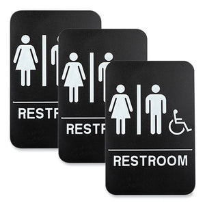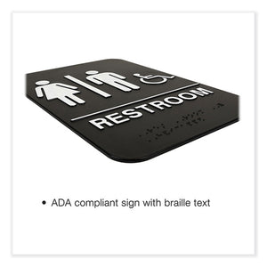 Indoor/Outdoor Restroom Sign with Braille Text and Wheelchair, 6" x 9", Black Face, White Graphics, 3/Pack
