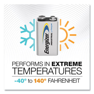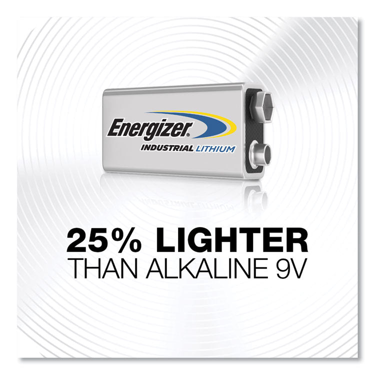 Power your industrial and professional devices with Energizer Industrial Lithium 9V Batteries. Proven lithium performance keeps you on the job with the longest-lasting professional batteries in high tech devices at construction sites, facility maintenance, repair services, medical centers, business offices, classrooms and more. Because your tools of the trade are an investment worth protecting, these industrial 9V batteries are 100% leakproof in standard use. They perform in extreme temperatures (-40°F to 140°F) and hold their power with up to 10 years of shelf life. All of these features are packed inside a lithium 9V battery that weighs 25% less than an alkaline 9V. Oh, and there's this-these 9V batteries provide up to 10 years of backup battery in AC-powered smoke detectors. So, for the precision devices and crucial equipment of your worksite, depend on the power and protection of Energizer Industrial Lithium 9V Batteries.