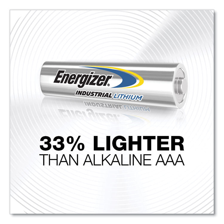 Power your industrial and professional devices with Energizer Industrial AAA Lithium Batteries. Construction site, facility maintenance, medical center, business office, classroom-wherever you work, the longest-lasting professional AAA batteries keep your electronics up for the job. In normal use, they're 100% leak proof to protect your work site devices, and they operate in temperatures ranging from -40şF to 140şF. And with a 25-year shelf life, you won't have device downtime. All of that lithium performance comes in a heavy-duty AAA battery that weighs 33% less than an alkaline AAA. So, when work depends on automatic paper towel dispensers, hard hat lights, pulse oximeters, and more, you can rely on the power and protection of Energizer Industrial AAA Lithium Batteries.