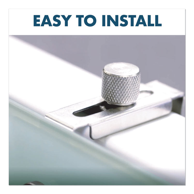 Have your very own message board, with a handy, personal-sized board that fits perfectly in cubicles, even if they have low walls. Tempered white glass surface dry-erase board is durable and will not stain or ghost; provides clean erasability. Sturdy enough to resist scratches and dents. Magnetic quality allows writing and posting of messages with dry-erase markers and rare earth magnets. Frameless board design is sleek and attractive. Two mounting hardware sets are included: adjustable brackets to hang board over cubicle walls and wall mount for traditional hanging. Writing in all colors is easily visible on the white glass board surface. 16:9 aspect ratio.