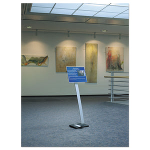 The INFO SIGN Tabloid Floor Stand from DURABLE are the go-to solution for effortless professional signage display. Easily showcase important information, instantly grabbing attention and effectively conveying your message right where you need it. Its sleek and professional appearance is perfect for directions, menu displays at host stands, guest information in lobbies and hotel entrances, valet and parking signage, safety alerts, restroom signage, and promotions. Keep your messaging up to date in the edge-to-edge, crystal-clear acrylic frame. Designed for easy insertion and removal of documents, you can update promotions, announcements, safety information, or directional signage without any hassle. Keeping your signage fresh, relevant, and engaging for your employees and customers. The frame rotates 360° so you can display signage in either portrait or landscape orientation to best suit your display needs, offering flexibility and versatility for various signage applications. Constructed from aluminum, and a heavy cast-iron base, the stand offers maximum stability, preventing any potential tipping. The clear acrylic frame protects documents from creasing, tearing, and smudging. For over 100 years, DURABLE has been synonymous with quality, design, and functionality. As a testament to this legacy, DURABLE products combine innovative design with a wealth of experience. Therefore, this is why INFO SIGN isn't just a sign holder; it's a commitment to presenting your business professionally. This unparalleled quality and attention to detail ensures your signage makes a lasting impression.