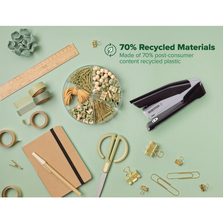 Elevate your stapling experience with the Bostitch inPower™ Eco-Friendly Stapler. It features One-Finger™ Stapling Technology, making it effortless to bind documents, all while featuring construction made almost entirely from post-consumer recycled plastic. The sleek body adds durability and elegance, allowing you to staple up to 25 sheets with ease. The ergonomic design reduces hand strain, and the stapler operates jam-free with standard staples. It even doubles as a bulletin board tacker for added versatility. Whether you're at home, school or the office, this stapler combines efficiency with an environmentally responsible choice to upgrade your workspace.