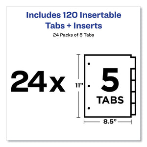 Big Tab dividers are bigger providing 50% more writing space than standard tabs. Special tab design allows easy insertion and removal, but keeps insert securely in place. Reinforced binding edge. White or buff paper dividers with clear or multicolor insertable tabs. It's easy to customize inserts using free templates from Avery Design & Print. Three-hole punched for use in standard ring binders, mini size 5.5 x 8.5 dividers are seven-hole punched for small binders and organizers, and legal size are 4-hole punched for legal size binders. Handwrite or print inserts on laser and inkjet printers.