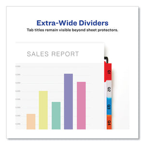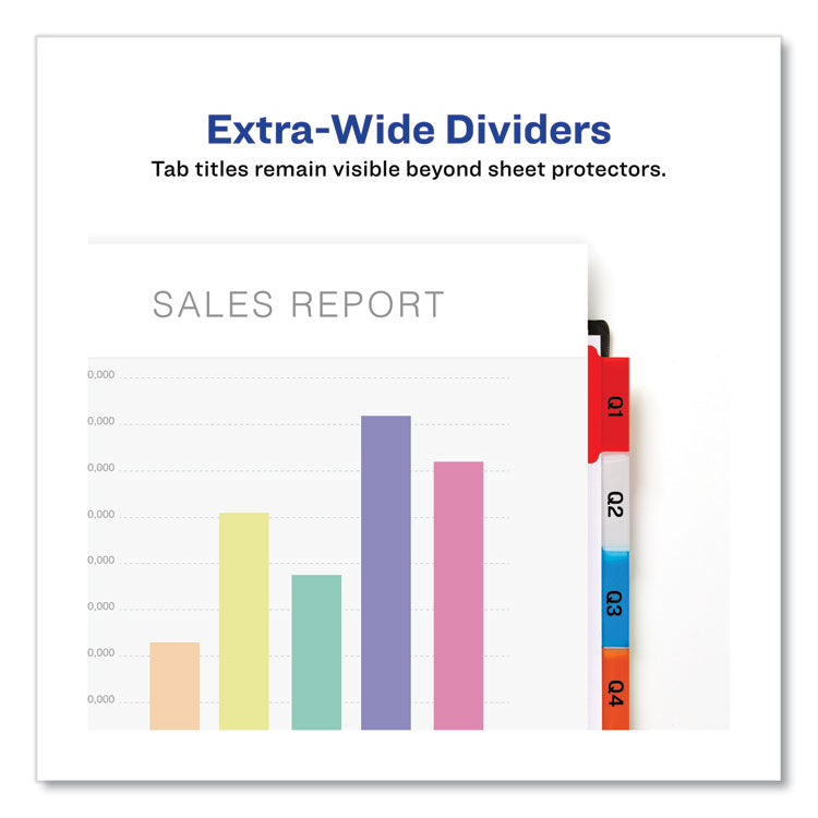 Big Tab dividers are bigger providing 50% more writing space than standard tabs. Special tab design allows easy insertion and removal, but keeps insert securely in place. Reinforced binding edge. White or buff paper dividers with clear or multicolor insertable tabs. It's easy to customize inserts using free templates from Avery Design & Print. Three-hole punched for use in standard ring binders, mini size 5.5 x 8.5 dividers are seven-hole punched for small binders and organizers, and legal size are 4-hole punched for legal size binders. Handwrite or print inserts on laser and inkjet printers.