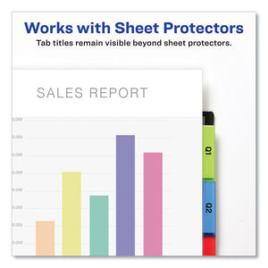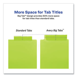 Strong organization and storage capabilities are yours with the help of these Big Tab Two-Pocket Insertable Plastic Dividers. Each divider features double plastic pockets, one on each side of the divider, to provide extra storage space for your important papers. The Big Tab design allows you to use larger fonts or more lines of text than on typical inserts for easier reading or more detailed labeling. Use a free template from Avery Design & Print to customize tabs titles onto the included label sheets using your computer and printer. The tabs' unique design keeps inserts from falling out, so your dividers stay securely labeled. Constructed with durable plastic, these dividers offer lasting organization in a big way. Handwrite or print inserts on laser and inkjet printers.