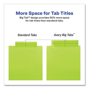 Strong organization and storage capabilities are yours with the help of these Big Tab Two-Pocket Insertable Plastic Dividers. Each divider features double plastic pockets, one on each side of the divider, to provide extra storage space for your important papers. The Big Tab design allows you to use larger fonts or more lines of text than on typical inserts for easier reading or more detailed labeling. Use a free template from Avery Design & Print to customize tabs titles onto the included label sheets using your computer and printer. The tabs' unique design keeps inserts from falling out, so your dividers stay securely labeled. Constructed with durable plastic, these dividers offer lasting organization in a big way. Handwrite or print inserts on laser and inkjet printers.
