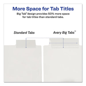 Sometimes good things do come in big packages. Big Tab™ Insertable Plastic Dividers offer extra convenience for your binder or notebook. The larger style insertable tabs accommodate inserts that you can print with sizeable fonts or more lines of text than on a typical insert for even more eye-catching power. Use free templates from Avery Design & Print to create professional-looking tabs. An easy-access notch at the top of the tab lets you slide inserts in and out with ease, while a secure indent point at the base of the tab keeps your insert from falling out. Translucent plastic offers a durable solution, so you can enjoy long-lasting organization of all your big ideas. Handwrite or print inserts on laser and inkjet printers.