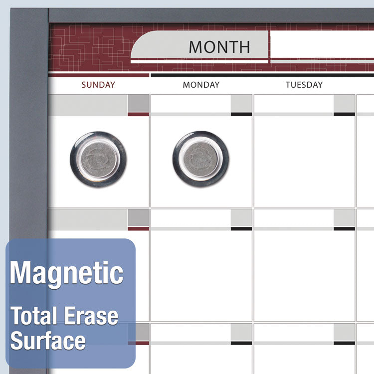 Effortlessly design custom-printed dry-erase boards using the Quartet template tool. Choose from a variety of Planning or Tracking Systems, Calendars, Workflow Charts, Personnel Boards or create your own system using a variety of on-line tools. Alter text, add logos and even upload photos! Save, email and print your customized artwork at your local office supply or quick print shop. Delivers quality performance when communication, organization and collaboration is needed in frequent-use office environments or personal workspaces. Hinged steel frame secures custom printed artwork. Clear, flexible, patented lens provides a Total Erase writing surface that resists staining and ghosting. Easy-to-clean, requires occasional use of Quartet cleaning solutions. Durable dry-erase surface doubles as a magnetic bulletin board. Slim profile, contemporary, graphite frame modernizes any office. Includes mounting system, built-in marker tray and one dry-erase marker.