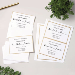 - Add an elegant touch to invitation cards, holiday cards, or any greeting cards with eye-catching matte white invitations with metallic gold borders.