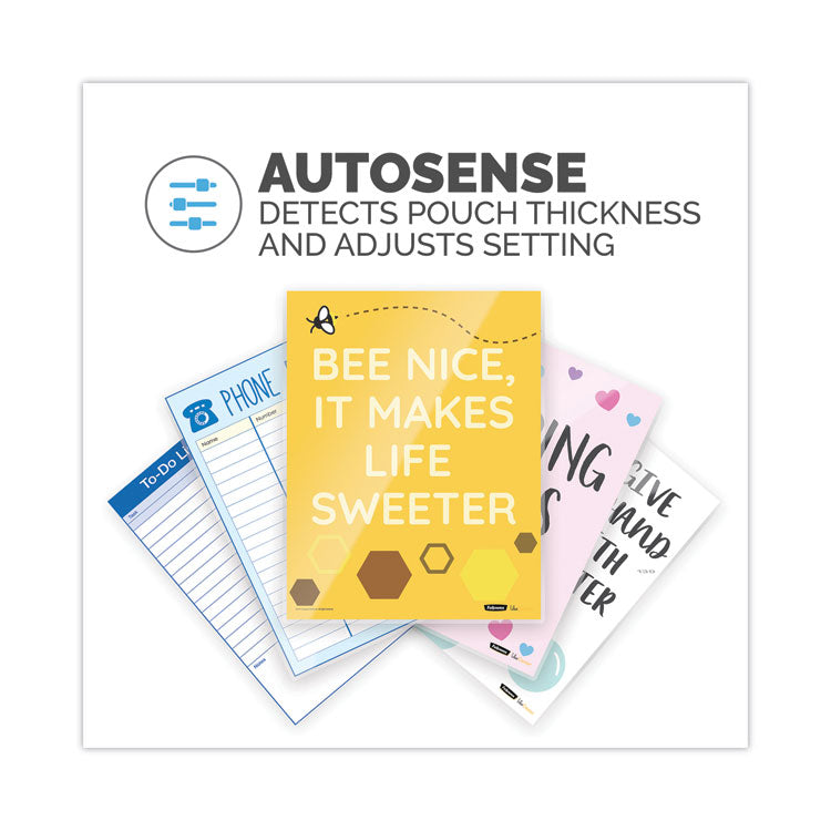 - Automatically detects pouch thickness and adjusts to the optimal laminating setting with AutoSense system.