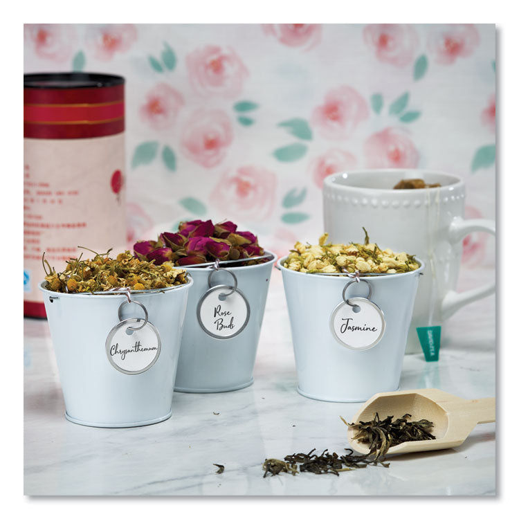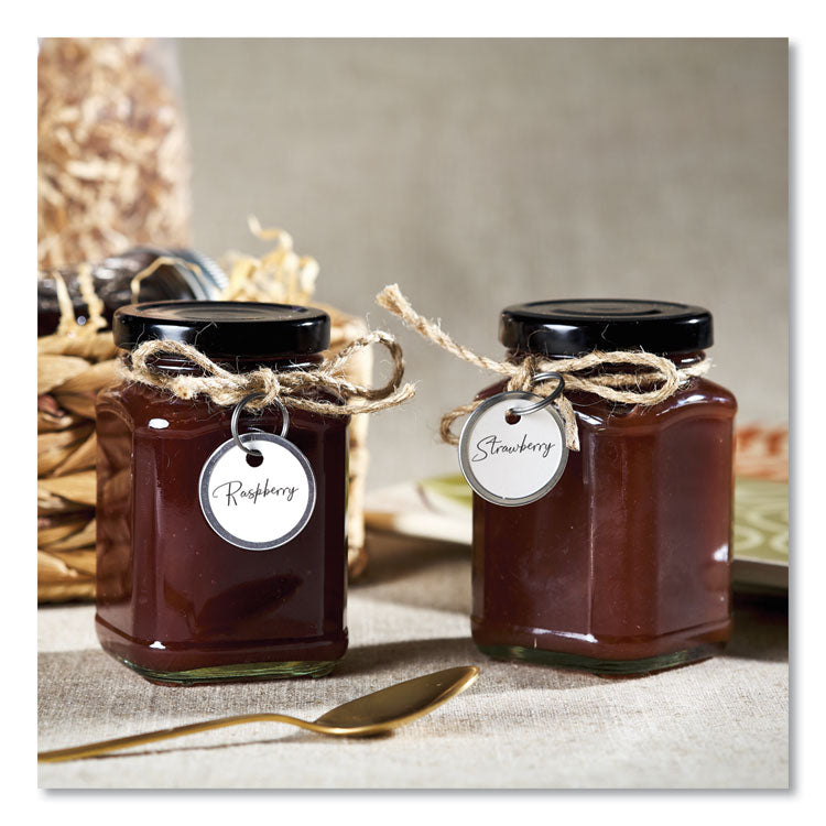 Hunting in vain for the key that fits a particular lock becomes a thing of the past with these easy-to-use Key Tags. Each tag features a split ring that slides easily onto your key for fast, convenient organization. A metal rim around the round tag aids in stability and durability for frequent handling. Inscribe your notes on white or colored tags for a clear, easily readable method of quick identification of each key's purpose. Whether you're juggling keys for automobiles, real estate or something else, these tags will help provide the key to increased efficiency.