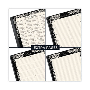 Lacey Planner features a lacy overlay with a cream floral pattern on black. Covers 13 months from January to January with Julian dates. High-quality paper features superior ink bleed resistance. One week per two-page spread has ruled columns for each day with hourly appointments from 8AM to 6:00PM Monday through Friday. Weekends are untimed. One month per two-page spread has ruled daily blocks, notes space, and past/future month calendar references. Each month is tabbed to quickly flip to any date. Special pages include a holiday listing, 3-year reference calendar, event calendar, future planning, contacts and notes. Double-sided poly pocket for storage included. Durable twin wire binding.