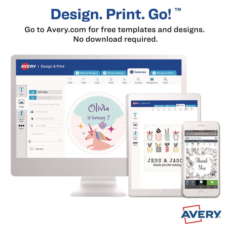 Make sure your handmade gifts and products stand out with Avery labels that offers the professional finishing touch you need. The print-to-the-edge capability allows you to create bright, eye-catching full-bleed labels with sharp text and crisp images printed right to the edge of the stickers with no border or margin. Sure Feed technology helps deliver a more reliable feed through your printer to prevent print misalignments and paper jams. These printable stickers are quick and easy to apply with the patented Easy Peel label sheets with Pop-up Edge. Simply fold the sheet back to display the label edges for convenient and fast peeling that saves time and avoids label waste. Compatible with both laser and inkjet printers to provide crisp and vivid prints. Avery Design & Print makes it easy to create customized labels from your own home or business. The free browser-based software has everything you need to design gift labels, soap labels, thank you stickers, round stickers for kids, party favor labels, and more. Try it out today.