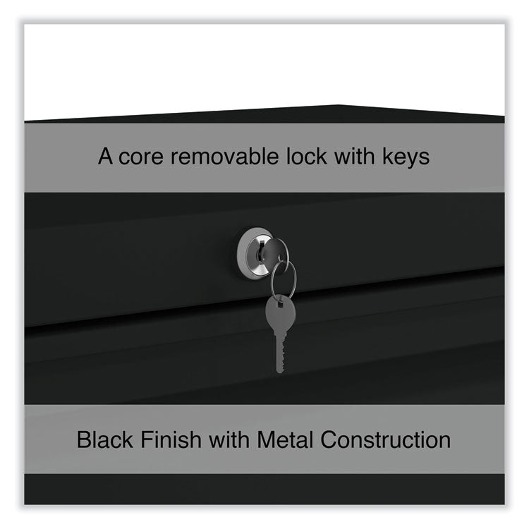 Drawers with side-to-side hang rails to accommodate letter/legal hanging files. Full drawer extension on steel ball bearing telescoping slide suspension helps drawers glide with ease. Stylish, full-width radius edge recessed pulls help to quickly open and close drawers. Anti-tipping interlock system allows only one drawer to open at a time. Single key core removable lock with two keys. Four adjustable leveling glides. Durable powder coated finish helps prevent scratches.