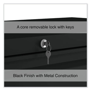 Drawers with side-to-side hang rails to accommodate letter/legal hanging files. Full drawer extension on steel ball bearing telescoping slide suspension helps drawers glide with ease. Stylish, full-width radius edge recessed pulls help to quickly open and close drawers. Anti-tipping interlock system allows only one drawer to open at a time. Single key core removable lock with two keys. Four adjustable leveling glides. Durable powder coated finish helps prevent scratches.