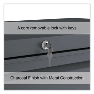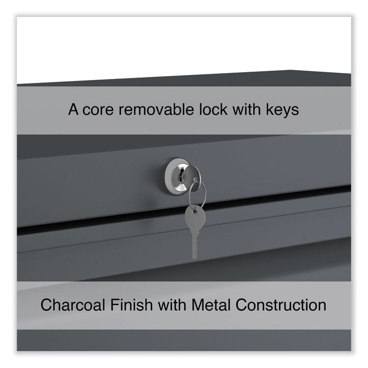 Drawers with side-to-side hang rails to accommodate letter/legal hanging files. Full drawer extension on steel ball bearing telescoping slide suspension helps drawers glide with ease. Stylish, full-width radius edge recessed pulls help to quickly open and close drawers. Anti-tipping interlock system allows only one drawer to open at a time. Single key core removable lock with two keys. Four adjustable leveling glides. Durable powder coated finish helps prevent scratches.