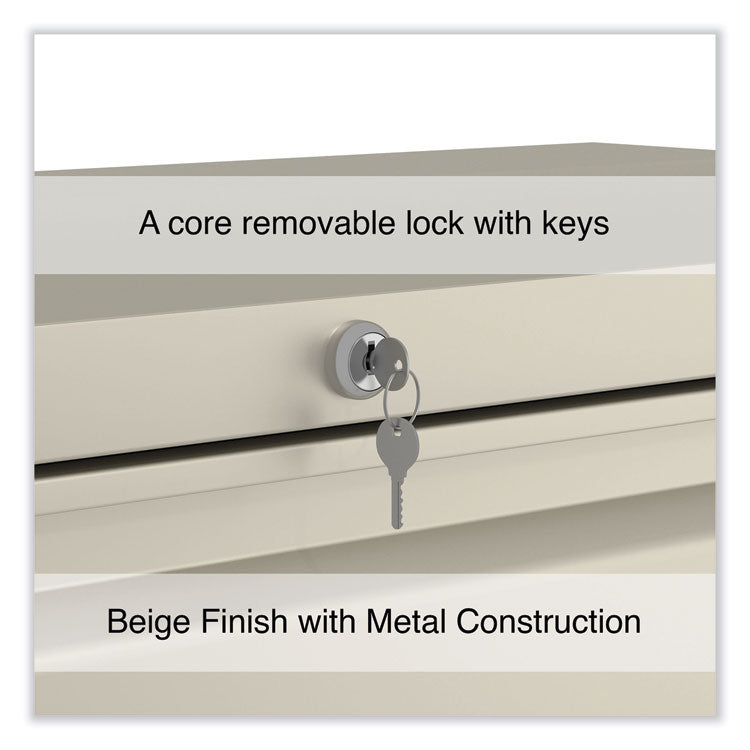 Drawers with side-to-side hang rails to accommodate letter/legal hanging files. Full drawer extension on steel ball bearing telescoping slide suspension helps drawers glide with ease. Stylish, full-width radius edge recessed pulls help to quickly open and close drawers. Anti-tipping interlock system allows only one drawer to open at a time. Single key core removable lock with two keys. Four adjustable leveling glides. Durable powder coated finish helps prevent scratches.