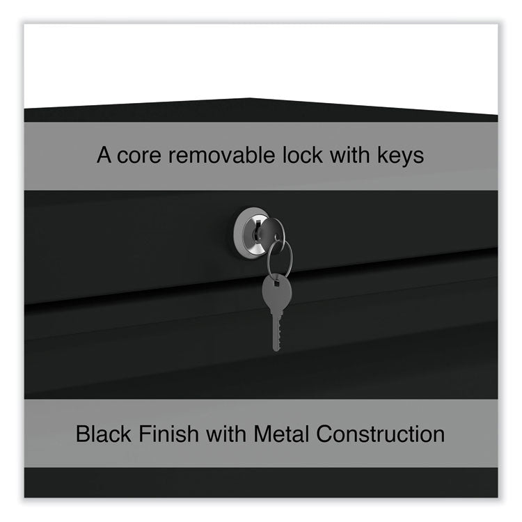 Drawers with side-to-side hang rails to accommodate letter/legal hanging files. Full drawer extension on steel ball bearing telescoping slide suspension helps drawers glide with ease. Stylish, full-width radius edge recessed pulls help to quickly open and close drawers. Anti-tipping interlock system allows only one drawer to open at a time. Single key core removable lock with two keys. Four adjustable leveling glides. Durable powder coated finish helps prevent scratches.