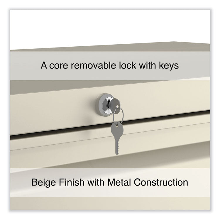 Drawers with side-to-side hang rails to accommodate letter/legal hanging files. Full drawer extension on steel ball bearing telescoping slide suspension helps drawers glide with ease. Stylish, full-width radius edge recessed pulls help to quickly open and close drawers. Anti-tipping interlock system allows only one drawer to open at a time. Single key core removable lock with two keys. Four adjustable leveling glides. Durable powder coated finish helps prevent scratches.