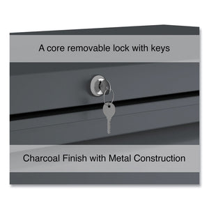 Drawers with side-to-side hang rails to accommodate letter/legal hanging files. Full drawer extension on steel ball bearing telescoping slide suspension helps drawers glide with ease. Stylish, full-width radius edge recessed pulls help to quickly open and close drawers. Anti-tipping interlock system allows only one drawer to open at a time. Single key core removable lock with two keys. Four adjustable leveling glides. Durable powder coated finish helps prevent scratches.