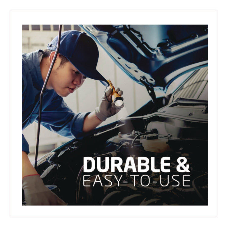 Heavy-duty flashlight for work-site use in wet or demanding conditions. Bright yellow, corrosion-resistant polypropylene construction has been water- and drop-tested for reliability. Constructed from non-conductive materials. Convenient to carry or stow.