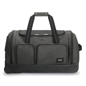 Leroy Rolling Duffel with fully padded 15.6" laptop compartment. Two front zippered pockets. Separate shoe/laundry compartment. Push-button telescoping handle system. Carry handles. Easy glide wheels.