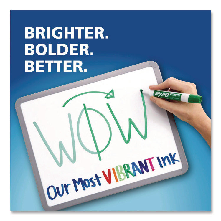 Create high impact marks and track, schedule and present clearly. High-quality ink-delivery system ensures consistent, skip-free results, while bold, vivid colors make it easy to see what's written from a distance. EXPO® Low-Odor Dry-Erase Markers always erase cleanly and easily from whiteboards and other non-porous surfaces such as porcelain, melamine and glass, simply with a dry cloth or a standard whiteboard eraser; but for optimal results, EXPO® whiteboard erasers are recommended. As their ink is specially designed to be low-odor and quick drying, they're the perfect dry erase marker for use just about everywhere: classrooms, offices, homes, boardrooms and more.