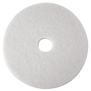 3M™ White Super Polish Pad 4100 is used for light cleaning under automatic scrubbers and removes soil and scuff marks with minimal dulling of finish. Uniform distribution of fine cleaning particles throughout the pad's fibers, not just on the surface, distinguishes it from much of the competition. Durable, conformable polyester fibers provide maximum pad-to-floor contact, and open construction resists loading and clogging. For use with rotary and automatic floor machines running at low speed (175-600 rpm). Use for light daily cleaning, spray buffing, and dry buffing soft finishes. This polishing pad is also used on wood floors. The pad is reversible.