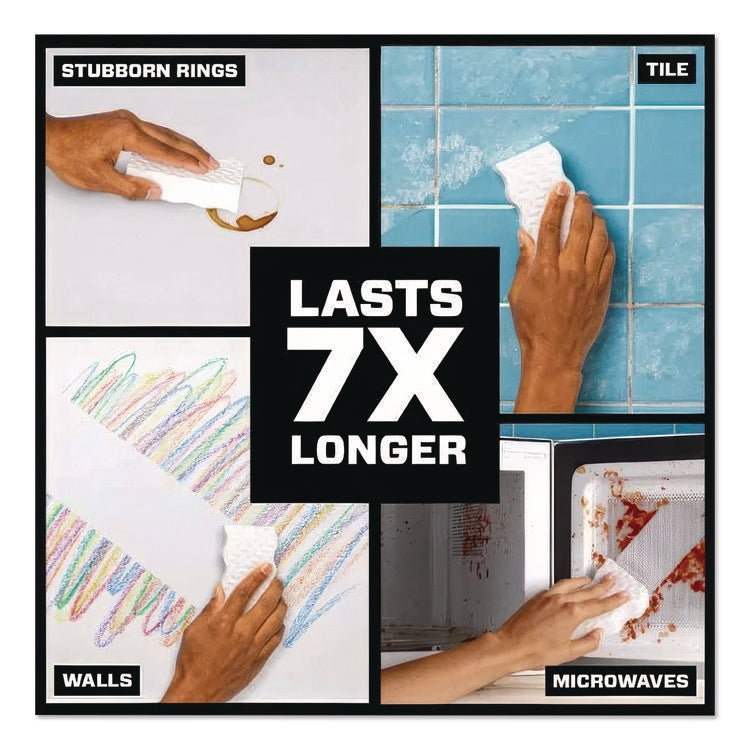 The Mr. Clean Magic Eraser Ultra Thick multi-surface cleaner lasts seven times longer than the Original Magic Eraser: no more sponges or other cleaning products needed. Just wet, squeeze, and erase over 150 messes with ease. The heavy-duty cleaning micro-scrubbers reach deep into surface grooves, lifting away built-up dirt and grime. The Magic Eraser Ultra Thick is an all-purpose cleaner that tackles tough messes all over your house, inside and out. Use it as a bathroom cleaner on soap scum, tub rings, and water spots. Use it in your kitchen on permanent marker stains, greasy counters, and grimy stovetops. Use it outdoors on grill grates and patio furniture. Also makes a great shoe cleaner and wall cleaner. Add the Magic Eraser Ultra Thick cleaner to your arsenal of cleaning supplies today.
