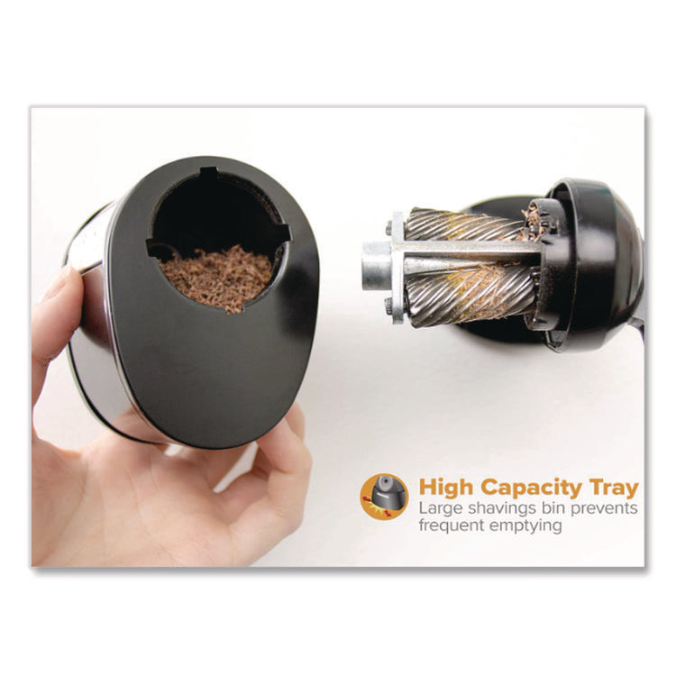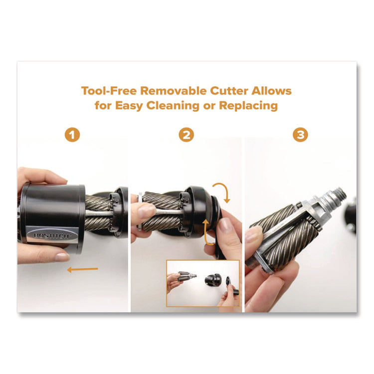 This Bostitch manual pencil sharpener is a fresh take on a classic! Each unit features an oversized crank knob making it easy for kids to grip and use. What makes this sharpener really special is its replaceable cutter. If the cutter ever becomes dull, just swap it out! Don't throw out the whole unit. We're all about saving time and money. Plus, our HHC2™ dual cutter technology extends the life of cutter by 6x. Tip Saver Technology™ shapes the perfect pencil tip and prevents over sharpening. This manual pencil sharpener has a high-capacity shavings tray to hold a high volume of pencil shavings. Remove it easily for quick cleaning. The easy rotate selector dial fits eight pencil sizes, making this mechanical pencil sharpener great for schools. With a durable all-metal construction and die cast base, this sharpener is built to last. The hand crank sharpener can be wall mounted using included screws or attached to a tabletop. Try out the Bostitch Manual Pencil Sharpener – the perfect sharpener for any setting!