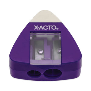 Conveniently sharpen your pencils and erase mistakes with the X-ACTO triangle manual pencil sharpener. With a built-in eraser, you'll be able to switch from sharpening to correcting in no time. The small, handheld pencil sharpener sharpens two different pencil sizes, while its portable and lightweight size makes it easy to carry in backpacks or tuck into desk drawers.