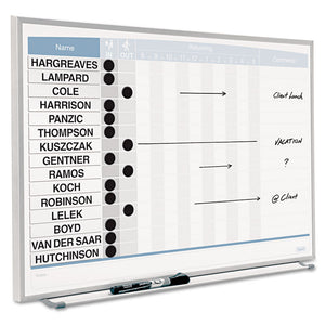 Track employees on the magnetic dry-erase surface. Thin-profile modular whiteboard doubles as bulletin board. Delivers quality performance when planning and organization are needed in any office environment. Innovative mounting system makes side-by-side mounting alignment flawless. Includes marker, black magnetic in/out circles and detachable marker tray for convenient accessory storage. Extend surface life with regular cleanings using Quartet cleaning solutions. Group with Quartet Matrix Modular Whiteboards, Bulletin Boards and Enclosed Matrix signage to achieve a complete organization, collaboration and communication system. Easily hang on cubicle walls with Cubicle Partition Hangers (Quartet MCH10, sold separately). Sleek, thin-profile design helps modernize any office.