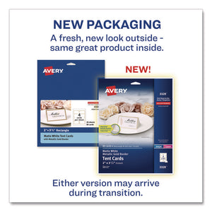 Add an elegant touch to meetings, conferences, and weddings with Avery 3328 Matte White 2" x 3.5" Cards with Metallic Gold Borders. Featuring a stunningly reflective pre-printed gold border on one side, the gilded edges add a brilliant glow to food identification cards and place cards for weddings, baby shower, anniversaries, and other celebrations. Both sides of the sheet are printable so that you can create beautiful double-sided designs. Designed to leave a smooth border, a series of precise cuts are used around the edge of each tent card to separate easily. A light indent in each tent card makes it easy to fold cleanly down the center. These cards are also made with 65lb cover/176 gsm cardstock that is compatible with both laser printers and inkjet printers. Our intuitive design software helps you line up your design within the metallic tent card borders so that your text and artwork fit perfectly. Pair these tent cards with other Avery labels, cards, tags and tent cards featuring metallic gold borders to complete the look. For best results, use the paper setting for cards and feed each sheet one at a time through your laser or inkjet printer.