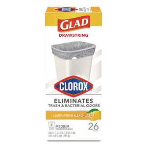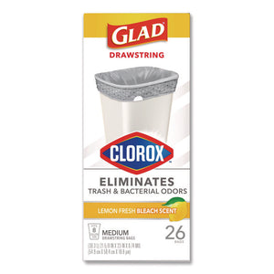 Medium Drawstring Trash Bags with Clorox, 8 gal, Lemon Fresh Bleach Scent, 0.74 mil, 23" x 21.63", Gray, 26/Box