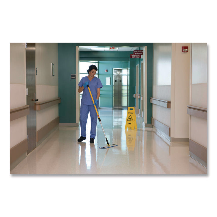 The Rubbermaid Commercial HYGEN Microfiber Damp Room Mop is constructed of premium split nylon/polyester blend microfiber that provides optimal damp mopping performance. HYGEN floor microfiber mops clean 45% better than string mops and 25% better than conventional microfiber mops with a zig-zag design that packs 17% more split microfiber into each mop. Hook-and-loop microfiber mop pads attach securely and can be easily replaced when necessary. These floor mops withstand heavy use with double-finished edges that retain their floor mop shape and can be laundered more than 500 times, 200 with bleach. These mop heads are color-coded blue for general purpose cleaning in low-risk areas.