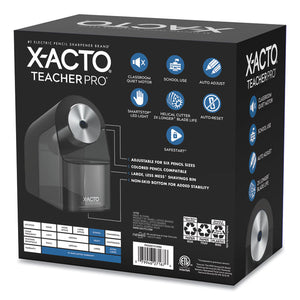 With its fast, break-resistant sharpening action, Teacher Pro® sharpeners help students spend less time sharpening and more time focusing on what mattes. SmartStop prevents over-sharpening by automatically shutting off the motor when the pencil reaches ideal sharpness; and just to make sure, a bold LED lets you know when your pencil is ready to write. An auto-adjust dial seamlessly accommodates nearly any pencil size, while a slip-resistant bottom keeps the sharpener steady. SafeStart® electric motor locks the blades in place when the extra-large, easy-to-empty shavings bin is removed. Compatible with colored pencils. Stay sharp with X-ACTO®!