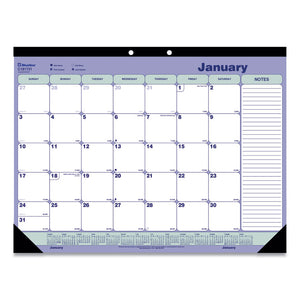 Stay organized with this helpful desk pad. It features a familiar one-month-per-page layout with a one-block-per-day format. A one-year reference calendar at the bottom of each page helps with long-term planning. The pads reinforced chipboard backer provides a solid, yet cushioned writing surface, and its perforated, top-bound sheets help ensure clean separation.