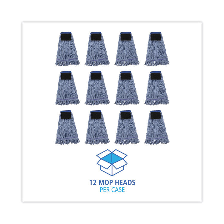 Boardwalk® Loop-End Mop with Scrub Pad is a good quality, economical, four-ply blend of cotton and synthetic fibers. The built-in scrubbing pad provides the highest level of abrasion, making it an excellent choice for foodservice areas. The blue yarn keeps the mop head looking newer for longer. Crafted with looped ends to reduce unraveling. Durable mop with a double-sewn tailband.