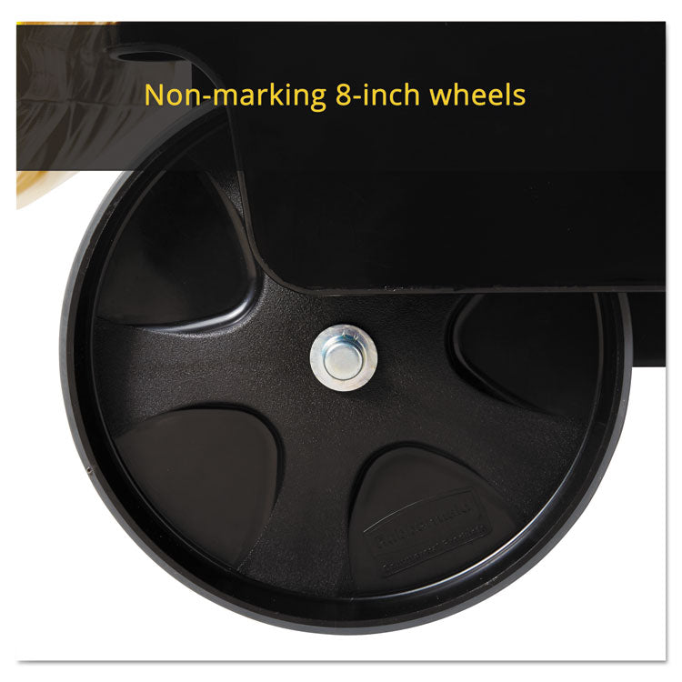 The Rubbermaid Commercial Utility Cart with Zippered Yellow Bag collects waste and transports tools efficiently on 8" non-marking wheels and 4" casters. This versatile utility cart has 3 lipped shelves, and a zippered yellow vinyl bag for collecting refuse or launderable items. The surface of the top shelf features tool grips for keeping frequently used items at hand wherever this service cart travels.