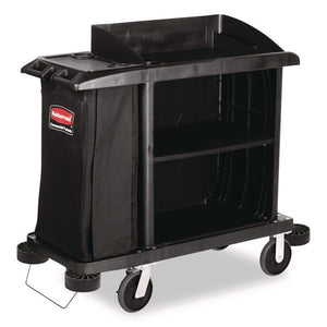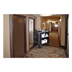 The Rubbermaid Commercial Utility Cart with Zippered Yellow Bag collects waste and transports tools efficiently on 8" non-marking wheels and 4" casters. This versatile utility cart has 3 lipped shelves, and a zippered yellow vinyl bag for collecting refuse or launderable items. The surface of the top shelf features tool grips for keeping frequently used items at hand wherever this service cart travels.
