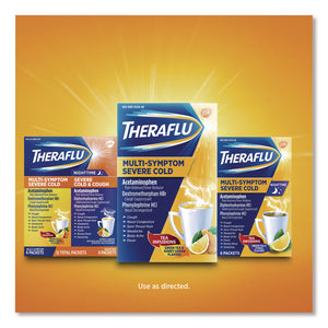 Fight even your worst cold or flu symptoms with Theraflu. Each packet of Theraflu Multi-Symptom Severe Cold Hot Liquid Powder contains Acetaminophen, Dextromethorphan HBr and Phenylephrine HCI to help get you back on your feet. This powerful cold medicine helps fight the nasal congestion, cough, body aches, sore throat pain, sinus congestion, headache and fever. One dose can be taken every 4 hours while symptoms persist, and do not take more than six packets in 24 hours unless directed by a doctor. To use, dissolve contents of one packet into 8 ounces of hot water. Sip while hot and consume the entire drink within 10 to 15 minutes. The power of Theraflu with warm and soothing effect makes it a perfect cold medicine. Theraflu is here to help you fight your cold symptoms with you every step of the way. For more information about Theraflu Multi-Symptom Severe Cold and Cough Hot Liquid Powder medicine such as warnings and ingredients, please read the information provided and written directly on the packet.