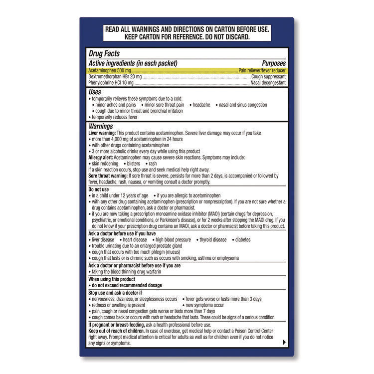 - Contains Acetaminophen, Dextromethorphan HBr, and Phenylephrine HCI for multi-symptom relief.