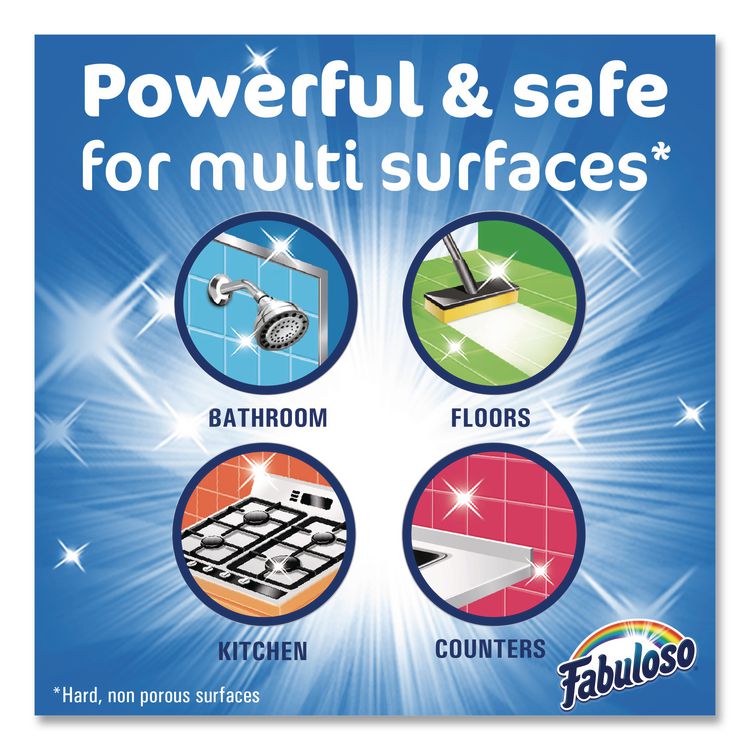 Fabuloso® Multi-Purpose Cleaner, 2X Concentrated Formula transforms your home or business with a fresh scent that lasts. Bring the fragrance of Fabuloso® indoors, and experience a warm, joyful feeling your friends and family will love. Fabuloso®'s 2X Concentrated Formula now provides 2x more active ingredients compared to non-concentrated Fabuloso Original, giving you 2x the dosage in the same bottle. Every colorful pour from the easy-pour bottle delivers a long-lasting, unmistakable freshness and leaves your home bright and clean. Use Fabuloso® Multi-Purpose Cleaner, on sinks, toilets, tubs, showers, kitchen and bathroom floors, sealed wood surfaces, appliances, counters, windows, mirrors, walls, doorknobs and furniture, and fill every room in your home with joy.