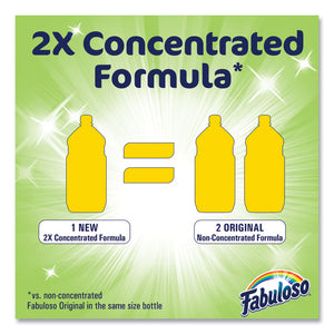 Fabuloso® Multi-Purpose Cleaner, 2X Concentrated Formula transforms your home or business with a fresh scent that lasts. Bring the fragrance of Fabuloso® indoors, and experience a warm, joyful feeling your friends and family will love. Fabuloso®'s 2X Concentrated Formula now provides 2x more active ingredients compared to non-concentrated Fabuloso Original, giving you 2x the dosage in the same bottle. Every colorful pour from the easy-pour bottle delivers a long-lasting, unmistakable freshness and leaves your home bright and clean. Use Fabuloso® Multi-Purpose Cleaner, on sinks, toilets, tubs, showers, kitchen and bathroom floors, sealed wood surfaces, appliances, counters, windows, mirrors, walls, doorknobs and furniture, and fill every room in your home with joy.