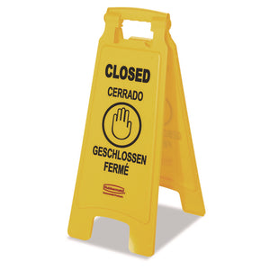 This bright yellow "Closed" sign is printed in English, French, German and Spanish for maximum effective communication with a large audience. It is lightweight and versatile; easy to transport. The two-sided model is excellent for use in small or narrow areas. It folds flat for quick and easy storage. Measures 12" deep when open.