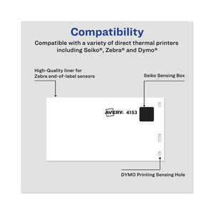 Durable thermal labels are scratch-resistant, smudge-free and resist water, dirt, dust and grease. Compatible with select DYMO®, Seiko®, Zebra® and Pitney Bowes® label printers. Packed in a secure bag to protect from light and ensure optimal performance. Permanent adhesive. Roll format with a 1" core.