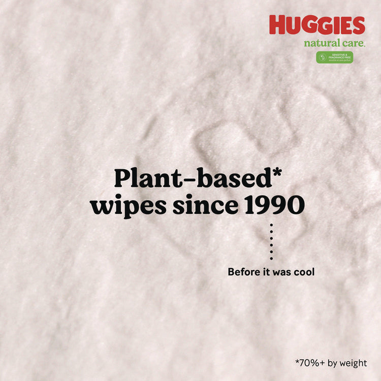 Huggies® Natural Care® Sensitive Baby Wipes are plant-based wipes, made with 99% purified water and 1% skin essential ingredients for a gentle clean. Infused with aloe and vitamin E, the unique base sheet locks-in and absorbs the mess to help keep baby's skin clean and moisturized. Safe for sensitive skin with no harsh ingredients, Huggies® Natural Care® unscented diaper wipes are hypoallergenic, dermatologically tested and pH-balanced to help maintain healthy skin. The wipes are fragrance-free, alcohol-free, paraben-free and do not contain phenoxyethanol or MIT, earning these diaper wipes the National Eczema Association's seal of approval. Extra soft and gentle, making them ideal for sensitive newborn skin. Plus, with EZ Pull, one-handed dispensing, it is easy to grab wipes without wasting sheets!