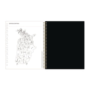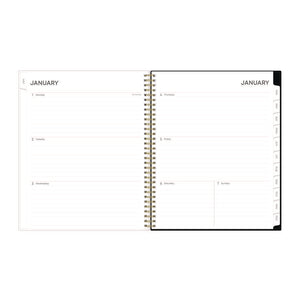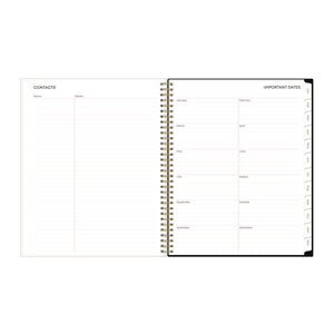 Be inspired by its serene Nevaeh cover design and get everything you need to organize tasks and be more productive with the Blue Sky® Nevaeh Weekly/Monthly Planner. Using the planner's flexible, open-format weekly spreads, keep track of appointments, daily tasks and takeaways. For longer-range planning, use the tabbed monthly views' daily blocks for specific events or its separate ruled notes area to capture anything that can't be easily pigeon-holed. Six past-year, untabbed monthly spreads help you transition into the new year, while additional pages for yearly goals, contacts, important dates and more help you stay on track. Durable cover features a field of wildflowers in bloom against a rich black background with gold-leaf accents, and its polished gold, snag-proof, twin-wire binding delivers easy page-turning. Thick, high-quality paper minimizes the potential for ink bleed through.